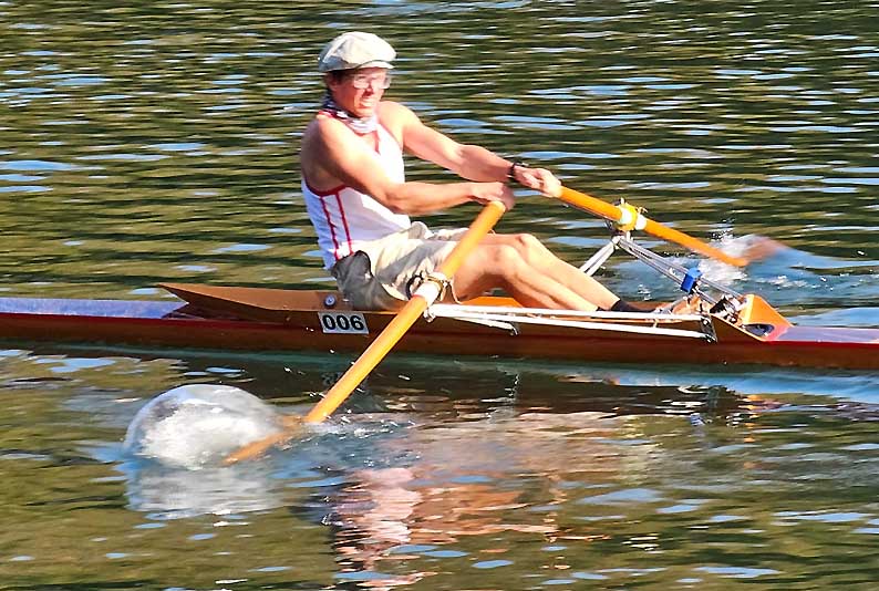 Zwei wertvolle Trainingswochen gingen für das Refit, Feinjustierung des Bootes sowie die Beschaffung alter Dollen und Ruder drauf. Aber gute Vorbereitung sollte sich bezahlt machen. Messingdollen wurden freundlicherweise von Gerhard Kalloch zur Verfügung gestellt, Alte Ruder vom WRV Austria und auch altes Rudergewand habe ich von Roland Vogtenhuber geborgt bekommen (Made in Western Germany). Moderne Ruder und SpeedCoach hat mir Xandi geborgt. Die ersten Ausfahrten (Moderne Dollen und Ruder) waren dank Wind und Welle mehr schlecht als recht. Den Spaß an der Sache musste ich erst finden und ich hatte ernsthafte Zweifel an der Sinnhaftigkeit der Unternehmung. Es wurde aber von Mal zu Mal besser. Irgendwann gab es dann doch noch windstille Tage und das Rudern wurde zum Genuss. Mit Veli und Clara als Sparringspartner früh morgens kamen dann in kurzer Zeit über 100 km zusammen. Joe und Barbara konnten zwischenzeitlich auch Holzboote finden. Die drei Boote wurden kurz vor der Regatta mit alten Dollen ausgerüstet. Unsere wenigen Testfahrten etwa eine Woche vor der Regatta waren technisch mehr als fordernd. Immerhin ist keiner von uns gekentert. Aber wir haben den Dreh herausbekommen. Die Zeiten aus 2024 machten uns zuversichtlich zumindest die Top 5 zu erreichen.